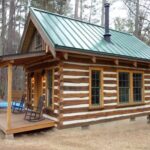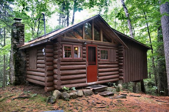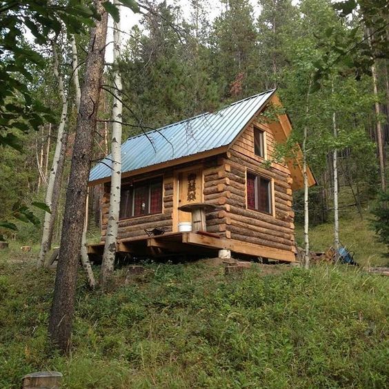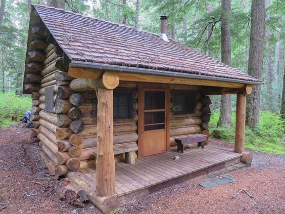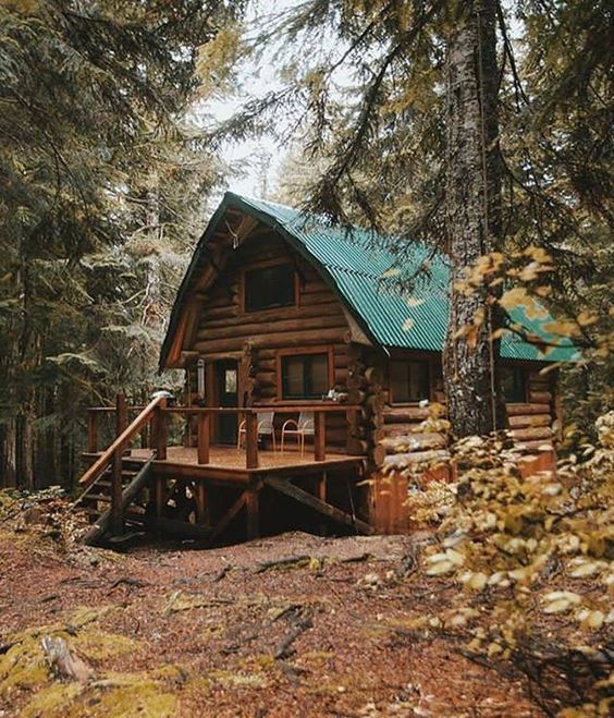 Cabaña en el bosque de madera redonda y puertas y ventanas de color verde
